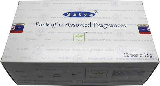 Set of 12 Nag Champa, Lavender, Arabian Musk, Egytian Jasmine, Musk, Dragon's Fire, Dragon's Blood, Prana, Ajaro, Money, Rose, Meditation by Satya Incense Bangalore (BNG)