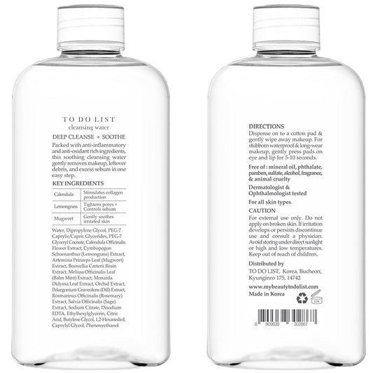 TO DO LIST Cleansing Water | Premium Micellar Water Make up Remover | Oil-free Lip & Eye Makeup Remover | Agua Micelar Cleanser | 8.45 Fl. Oz. | Korean Skin Care For All Skin Types