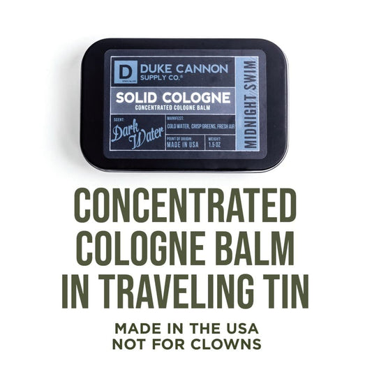 Duke Cannon Supply Co. Solid Cologne for Men Midnight Swim - Cold Water, Crisp Greens, Fresh Air - Concentrated Balm, Travel-Friendly Tin, 1.5 oz (1 unit)
