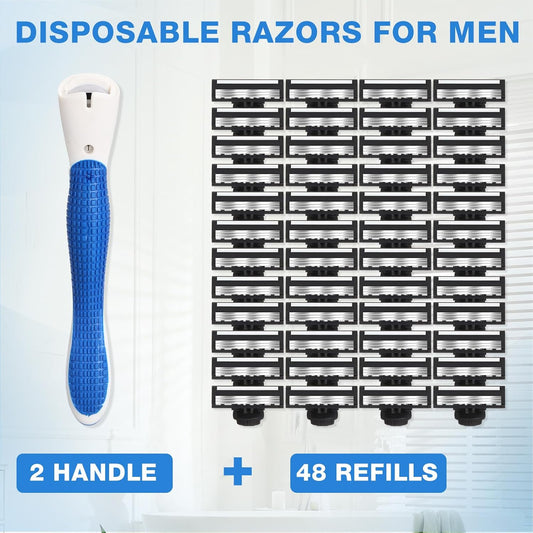 50 Pcs Refillable Three Blade Disposable Razors for Men Set Sensitive Skin Razor Travel Shave Set Shaving Gift Set, 2 Handle & 48 Cartridges