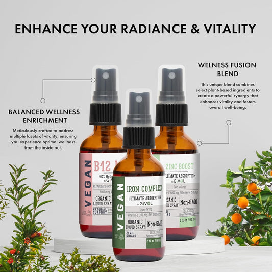 Iron Support Spray Bundle Liquid Vitamin B12 Methylcobalamin, Zinc Picolinate, and Bisglycinate | Non-GMO, Gluten-Free, Sugar-Free Iron Supplement | 2 Fl Oz Each | 360 Days Supply