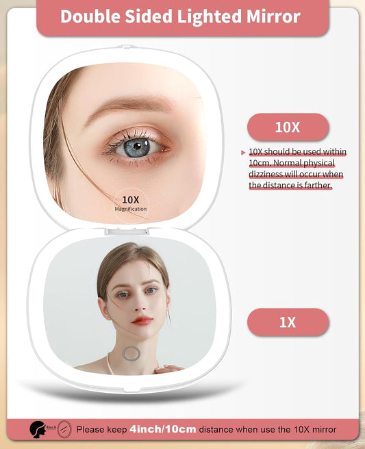 WOBSION Rechargeable Lighted Travel Makeup Mirror,1x/10x Compact Magnifying Mirror with Lights,Portable for Bag,4inch,Gift,White
