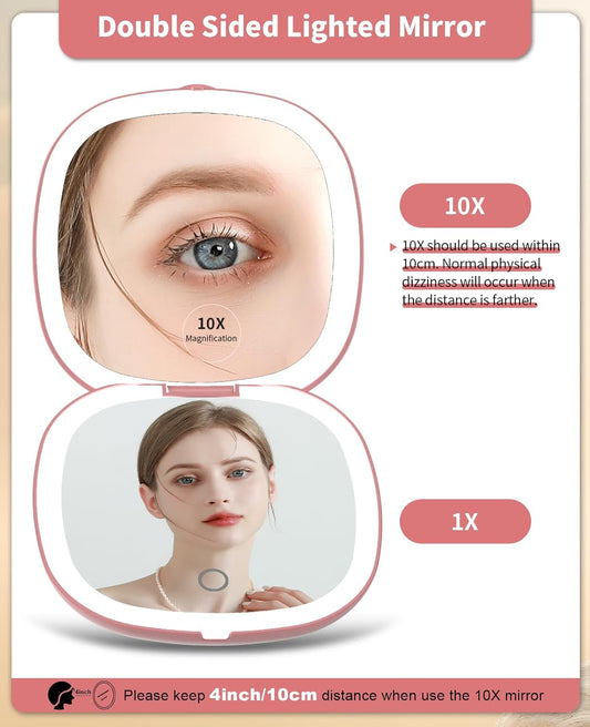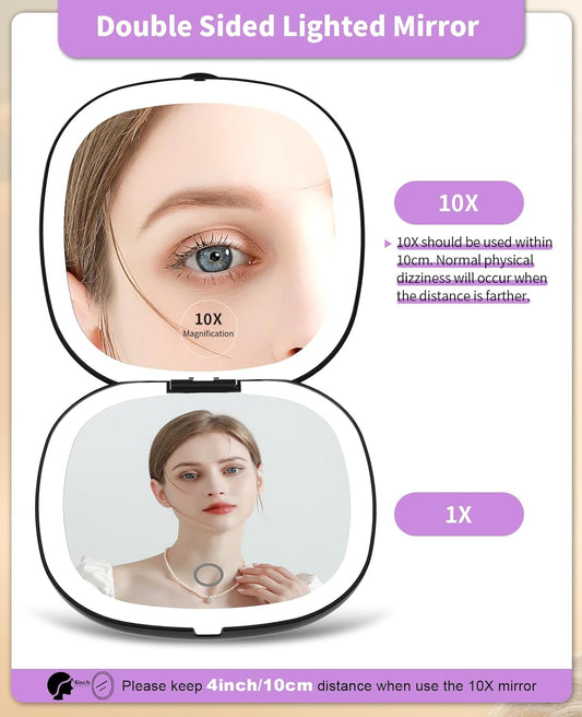 Portable LED Makeup Mirror - Compact Travel Mirror with Light, 10X Magnification, Adjustable Brightness, Rechargeable, for Her, Travel Accessories for Women, Ideal for Purse