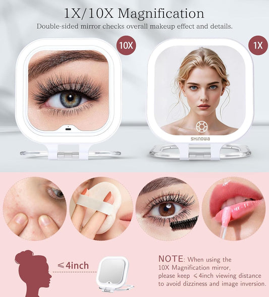 Shinowa Rechargeable Travel Makeup Mirror with 72 LED Lights, 1X/10X Magnifying Vanity Mirror with 3 Color Light, Folding Stand, 7 Inch Portable Dimmable Double Sided Compact Lighted Mirror, White