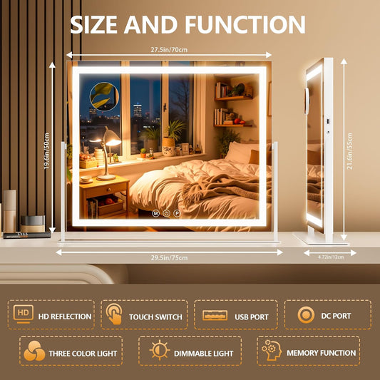 Vanity Mirror with Lights, 30'' x 22'' Lighted Makeup Mirror, Touch Screen with 3-Color Lighting, Dimmable for Vanity Desk Tabletop Square White