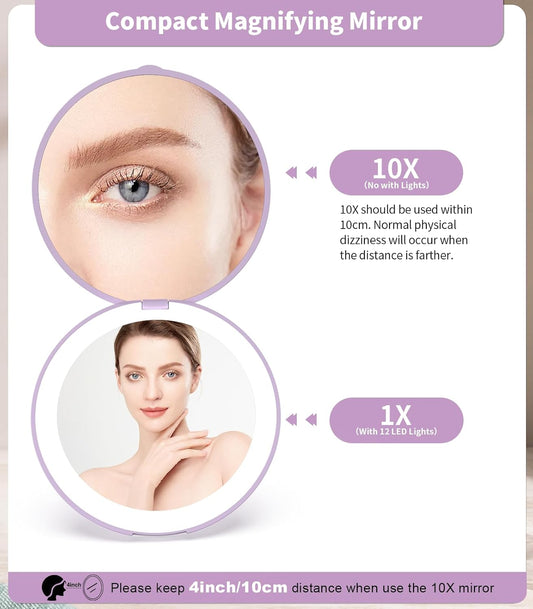 WOBSION Travel Compact Mirror,Portable 1x/10x LED Makeup Mirror with Magnification,Handheld 2-Sided Pocket Mirror, 3.5in Small Mirror for Purse,Handbag,Gift,Purple