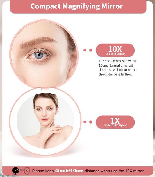 wobsion Rechargeable Compact Mirror, 1x/10x Magnification, Dimmable, Portable, LEDs, 4in Handheld, Pink