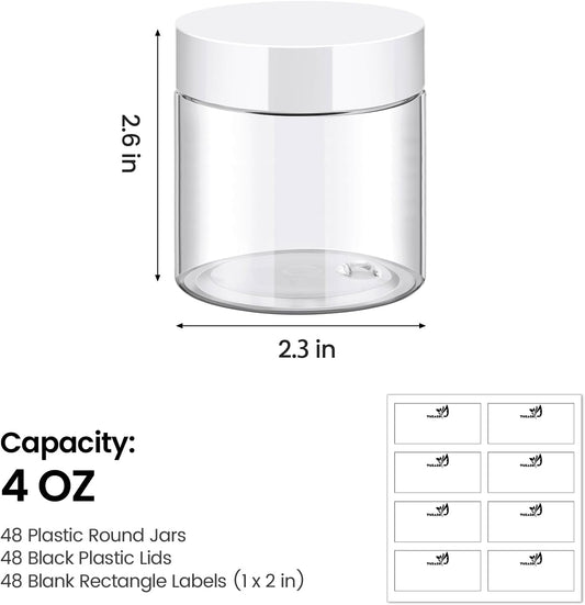 TUZAZO 48 Pack 4 Oz Plastic Container Jars with Lids and Labels BPA Free, Empty Round Clear Cosmetic Containers Plastic Slime Jars for Lotion, Cream, Ointments, Body Butter, Travel Storage (48)