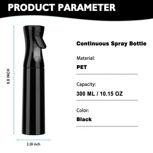 Spray Bottle for Hair (10.15OZ /300ML) Continuous Ultra Fine Mist Sprayer for Hair, Salons, Barber, Plants, Skin Care, Cleaning Black