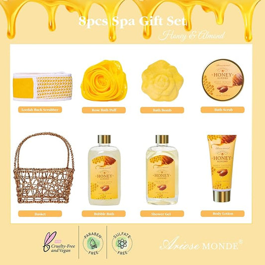 Bath Spa Gift Basket, Bath & Body Gift Set for Women & Men, Includes Shower Gel, Bubble Bath, Bath Salt, Bath Sponge, Spa Gift Box for Mother's Day, Birthday, Wedding, Honey & Almond 8pcs