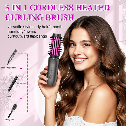 Cordless Hair Curling Iron Brush, 1.5" Mini Cordless Hair Curler, 3-in-1 Travel Curling Brush Hair Straightener Comb Rechargeable, 7000mAh Portable Ionic Heated Curling, Gold
