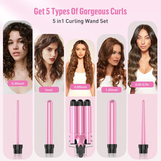 Waver Curling Iron Wand - BESTOPE PRO 5 in 1 Curling Wand Set with 3 Barrel Hair Crimper for Women, Fast Heating Crimper Wand Curler in All Hair Type, Women Gifts - Pink