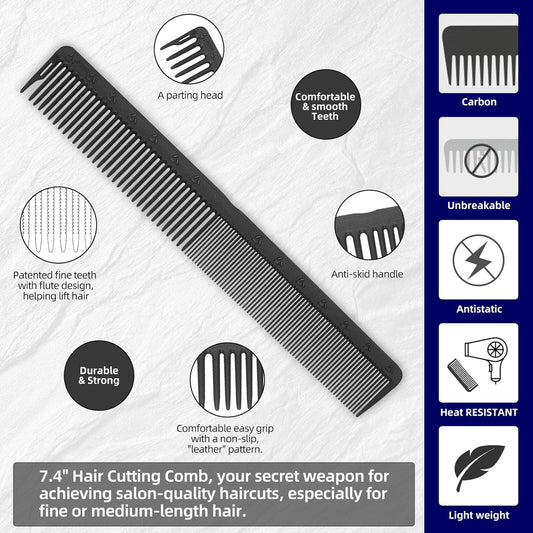 PERFEHAIR 2-Pack Professional Round Tooth Hair Cutting Comb - 7.4 Inch, Black Carbon Fiber Anti-Static & Heat Resistant, Durable Barber Combs with Fine & Wide Tooth for Precise Haircut for Men & Women
