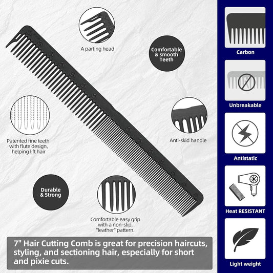 PERFEHAIR 2-Pack Professional Round Tooth Hair Cutting Comb - 7 Inch, Black Carbon Fiber Anti-Static & Heat Resistant, Durable Barber Combs with Fine & Wide Tooth for Precise Haircut for Men & Women