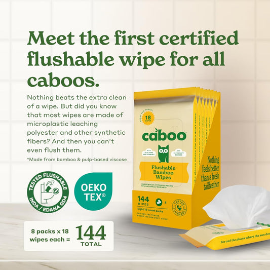 Caboo Tree Free Flushable Wipes, Travel Wipe, Certified Flushable, Septic Safe, Biodegradable Wipe for Adults, Pack of 8, Total of 144 Travel Toilet Wipes
