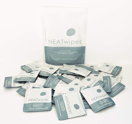 NEATwipes Hand Sanitizing Wipes | Travel Size | Disposable Wet Wipe & Biodegradable | Cucumber Aloe Essential Oil | Soothing Aloe & Glycerin | 24 Individually Wrapped Wipes