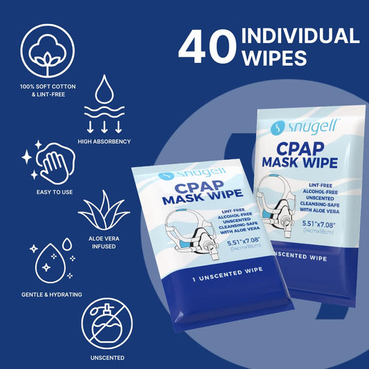 Snugell Unscented Individual CPAP Mask Wipes – Travel-Friendly 40-Pack– Lint & Alcohol-Free,Skin-Safe with Aloe Vera– Perfect for Convenient, Hassle-Free Cleaner & Sanitizer of CPAP Masks & Equipment
