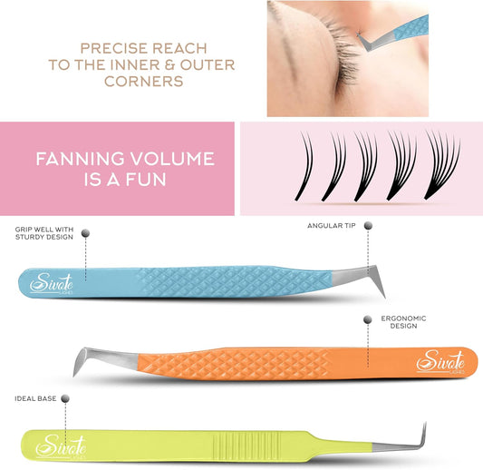 SIVOTE Lash Tweezers for Eyelash Extensions Fiber Tips, Set of 3, Volume, Volume Boot, 90 Degree Tweezers, Blue Yellow Orange
