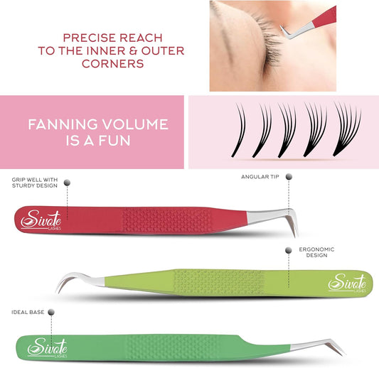 SIVOTE Lash Tweezers for Eyelash Extensions Fiber Tips, Set of 3, 45 Degree, Curved, Volume Boot, Dark Green Red Green