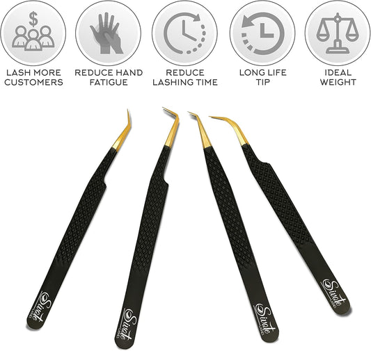 SIVOTE Fiber Tip Lash Tweezers for Eyelash Extensions with Diamond Grip, Black, Set of 4 - Precise Tips Japanese Steel for Classic, Volume & Mega Volume Lashes, Anti-Rust - Ideal for Lash Artists