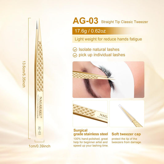 NAGARAKU Eyelash Tweezers, Precision Fiber Tip Tweezer for Eyelash Extensions Diamond Grip Anti-Static Anti-Slip Premium Gold Stainless Steel Pointed Lash Tweezers -Straight Tip Classic Tweezer AG-03