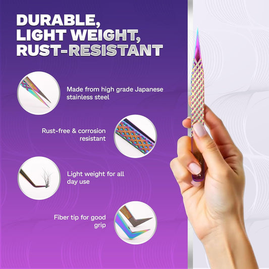 5 Pcs Fiber-Tip Japanese Steel Lash Tweezer Set with Leather Case, Professional Eyelash Tweezers for Lash Extensions – Titanium Coated, 90 & 45 Angled, Precision Pointed Tweezers (Rainbow Color)