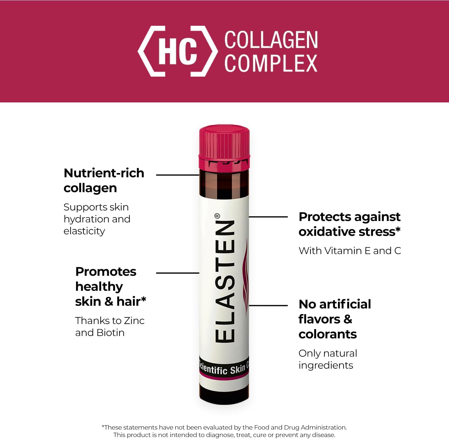 - PATENTED COLLAGEN COMPLEX: ELASTEN features the exclusive [HC] collagen with high bioavailability. This liquid collagen drink closely matches human collagen – essential for skin structure and elasticity.