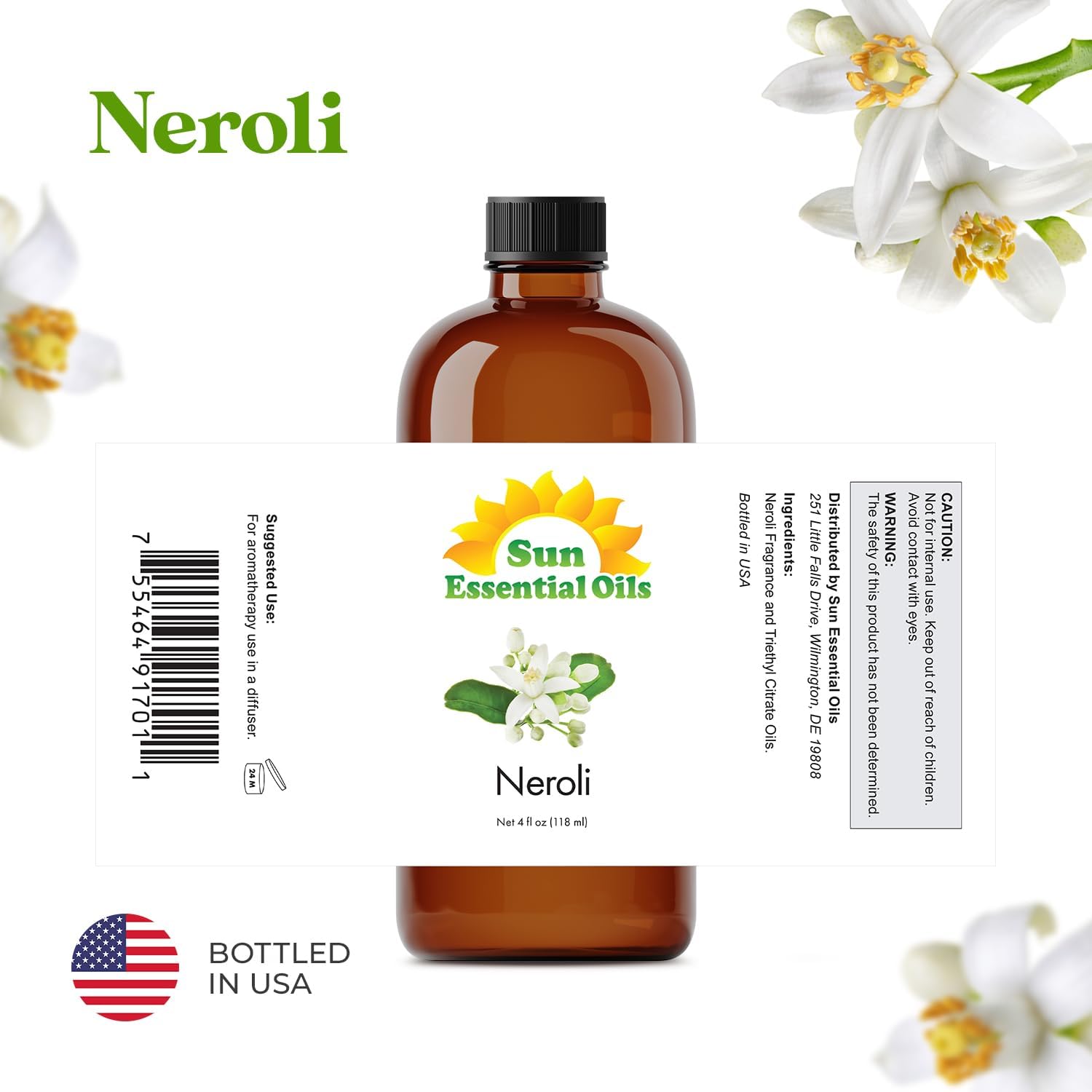 Sun Essential Oils - Neroli 4oz Bottle for Humidifier, Diffuser, Aromatherapy, Skin and Hair Care - Neroli Oil - Aromatherapy Oil