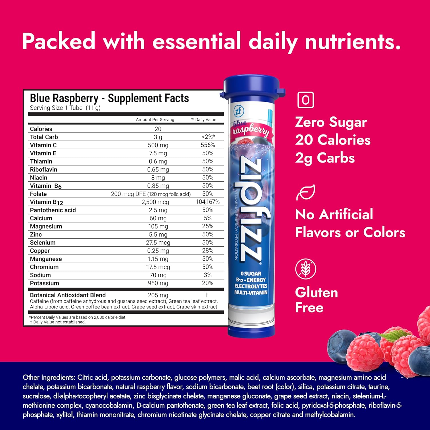 Zipfizz Daily Energy Drink Powder, Blue Raspberry, 20 Pack | 3-in-1 Sustained Energy, Rapid Hydration, and Essential Vitamins | Sugar-Free | Electrolyte Powder | Contains Vitamin B-12 & Antioxidants
