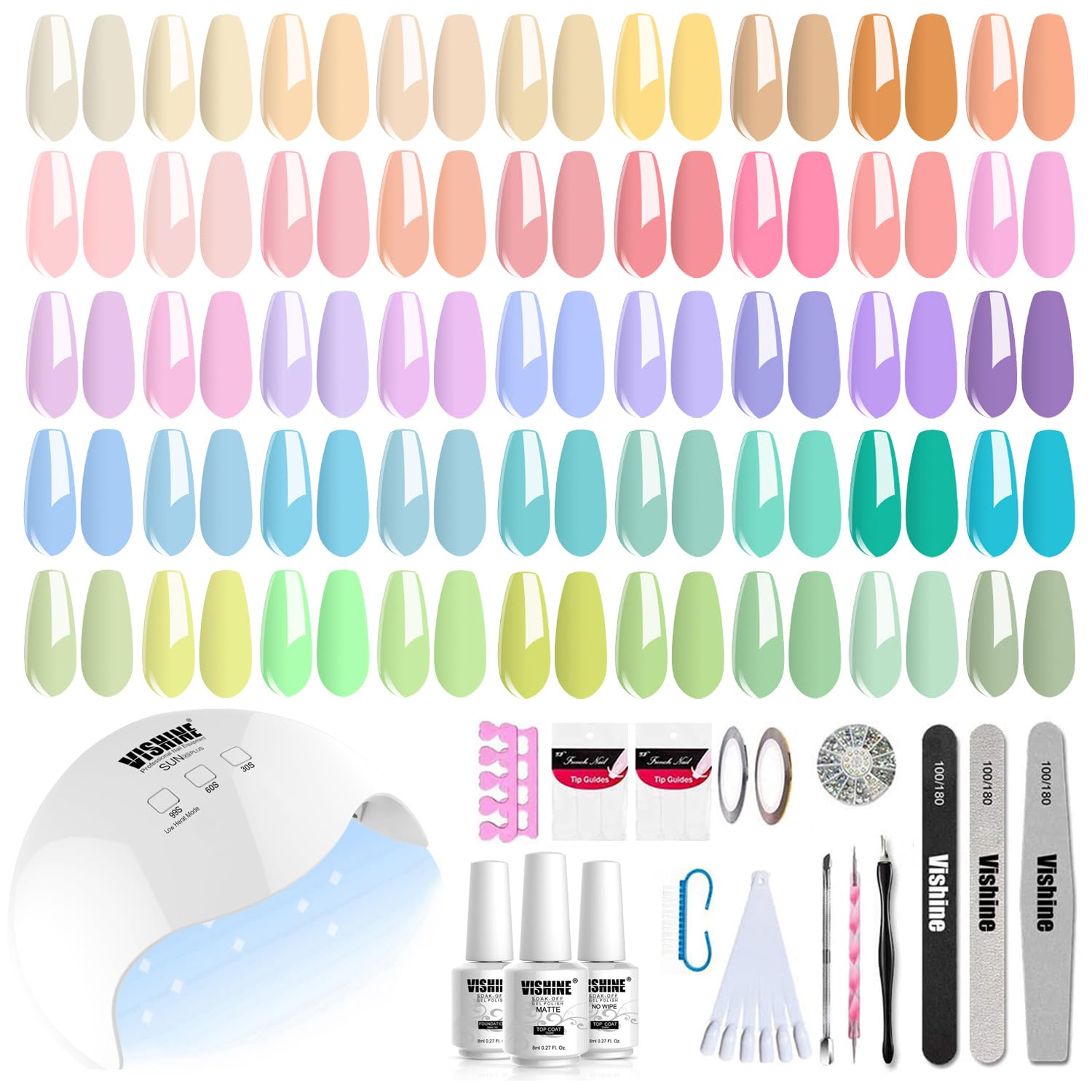 - Vishine Nail Starter Kit : 48W Curing Nail LED Lamp + 45PCS Colors Gel Polish + 1PCS Matte Top Coat + Top Base Coat Set + Nail Art Tools