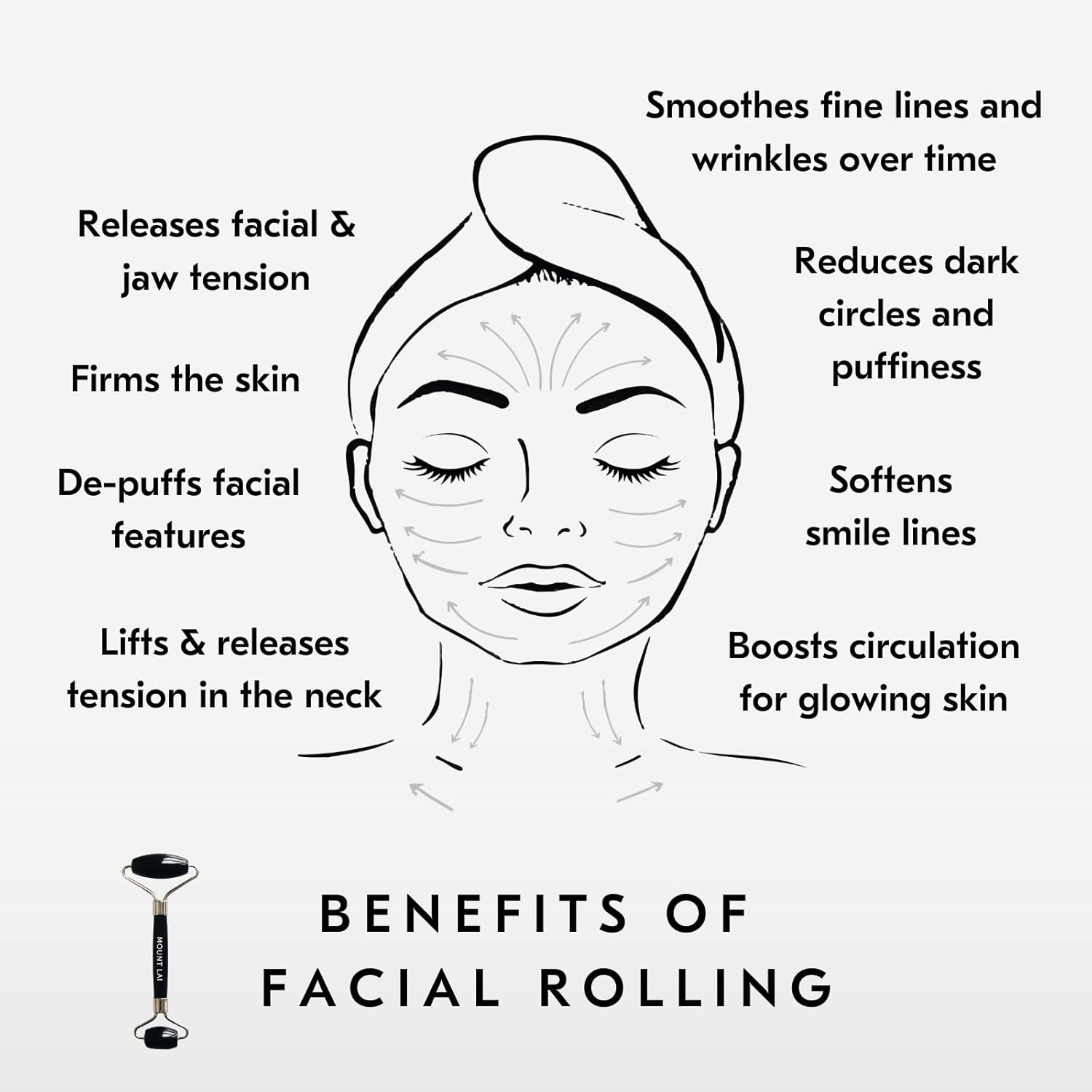 - Dual-ended design: Featuring two roller heads, one with a larger stone for the face and another facial roller with a smaller stone for the under-eye area, the Mount Lai Black Obsidian Facial Roller is versatile and perfect for all areas of the face.