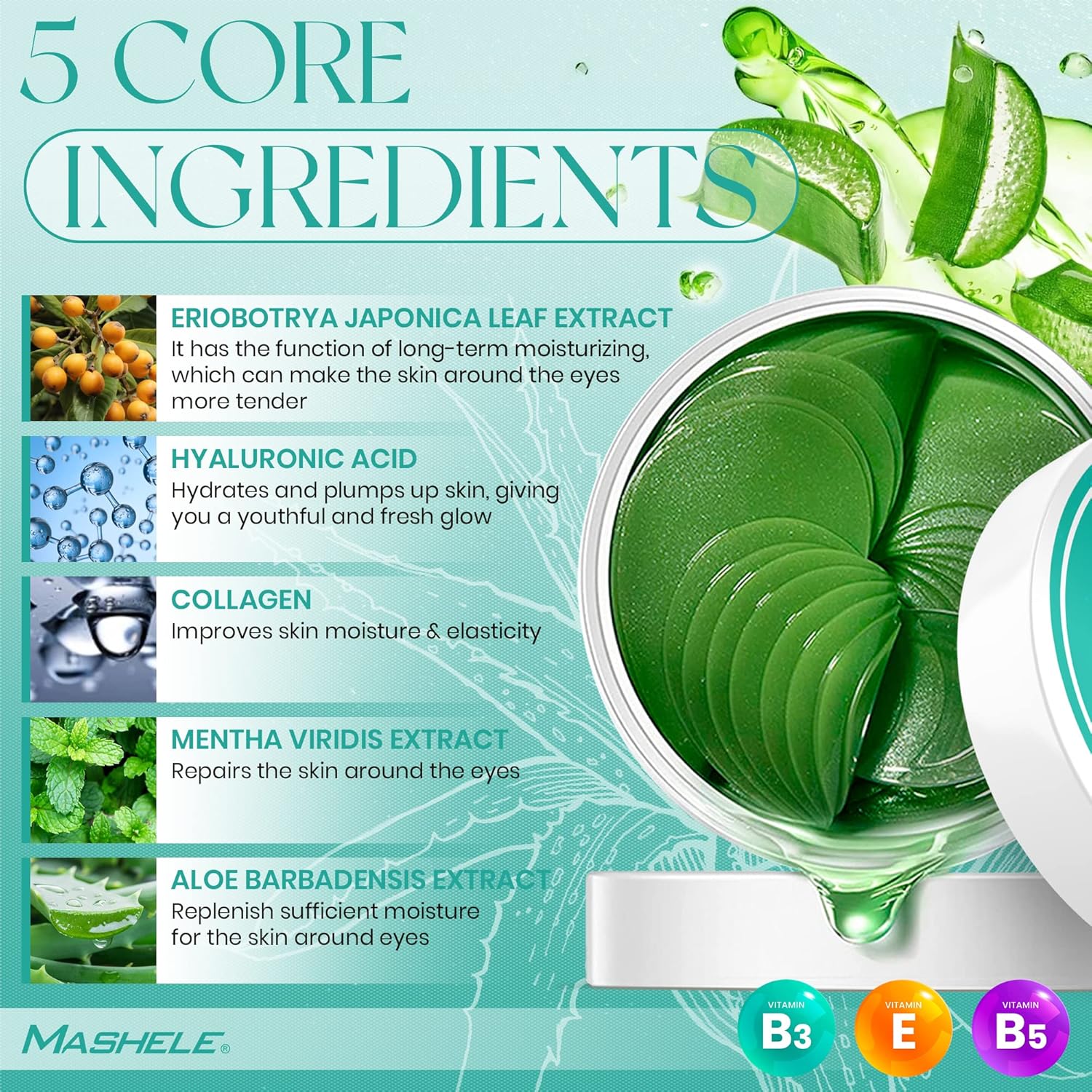 - ✅ [ Moisturizing & Hydrating Under Eye Patches ] Natural anti-wrinkle ingredients that provide a long-lasting moisturizing effect using under eye mask for the skin around the eyes. Your skin will be refreshed and hydrated from the very first use of MASHELE under eye mask patches