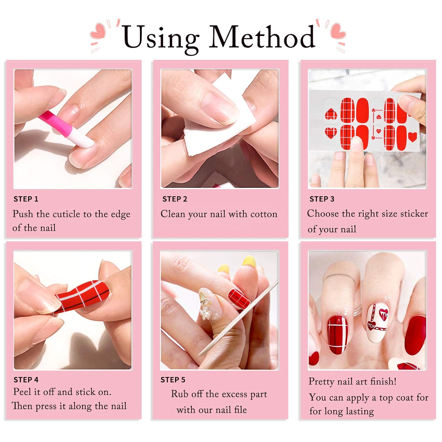 - 👫 Valentine Nail Art Stickers: A set of nail equipment that is very suitable for girls going out, easy to use, specially gifts for girls on Valentine's Day. Our Valentine full nail polish decals will give you a shine, dazzling and surprised look. Be the most beautiful girls.