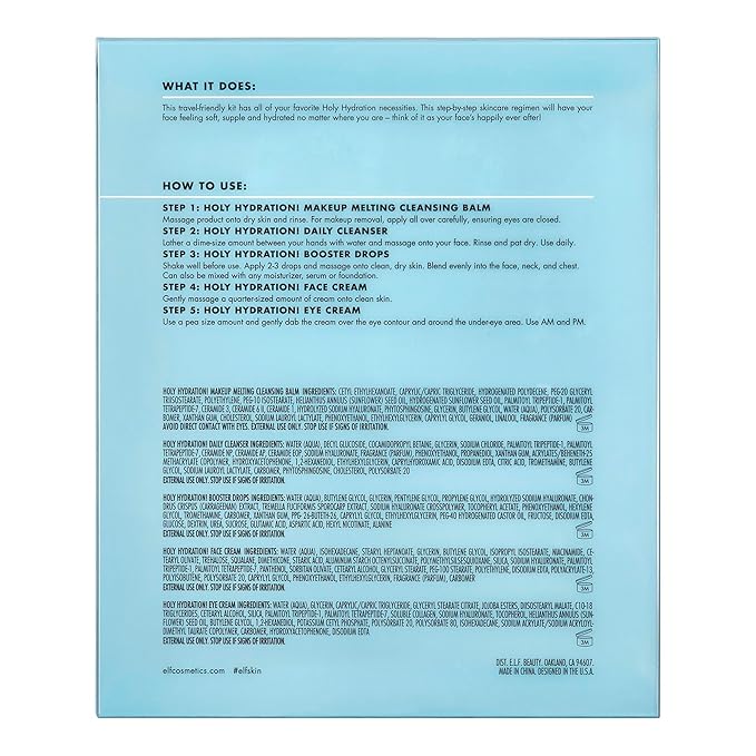 - A COMPLETE HYDRATION REGIMEN: This skincare kit has all of your favorite Holy Hydration necessities- a Holy Hydration. Daily Cleanser, Holy Hydration. Makeup Melting Cleansing Balm, Hydrating Booster Drops, Holy Hydration. Face Cream and Eye Cream.