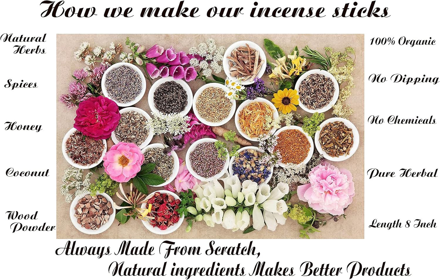 - 💚 100% NATURAL -Natural incense Sticks completely handmade MADE FROM SCRATCH by blending natural resins, Herbs, Spices with aromatic wood powders, charred coconut powder fragrant oils and honey. No Dipping in Toxic Chemicals