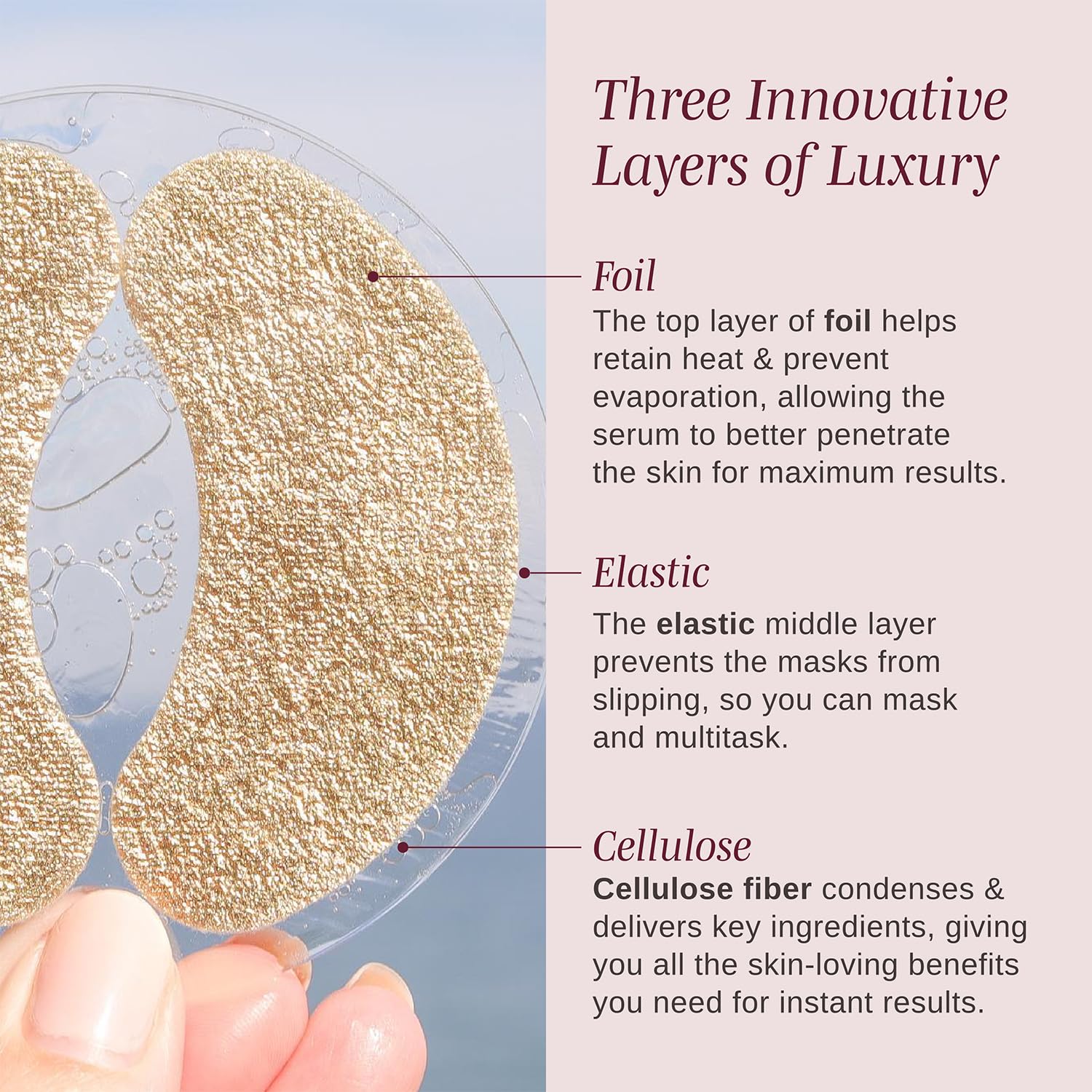 - Multi-Layer Absorption Technology - The top layer of foil helps prevent evaporation, allowing the serum to deeply penetrate the skin. Its elastic middle layer prevents the eye mask patches from slipping, while the bottom layer of cellulose fiber delivers key ingredients to the delicate under eye area to deliver maximum skin-loving benefits and a smooth skin texture.