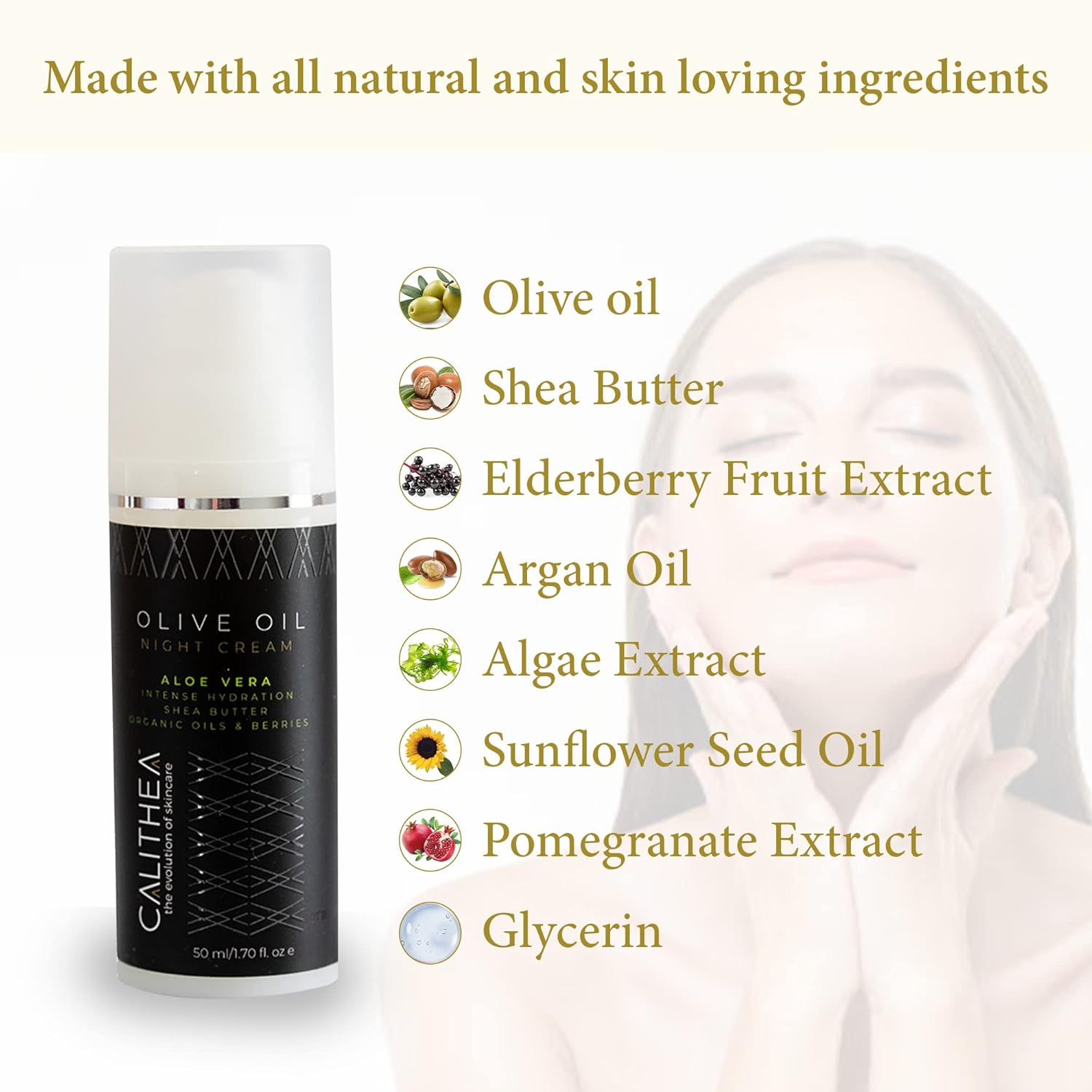 - Nourish your skin while you sleep: Our olive oil night cream is designed to work with your body's natural overnight renewal process. The blend of organic oils, extracts, and aloe vera in our formula helps to regenerate and maintain your skin's natural moisture levels, so you wake up with soft, supple skin.