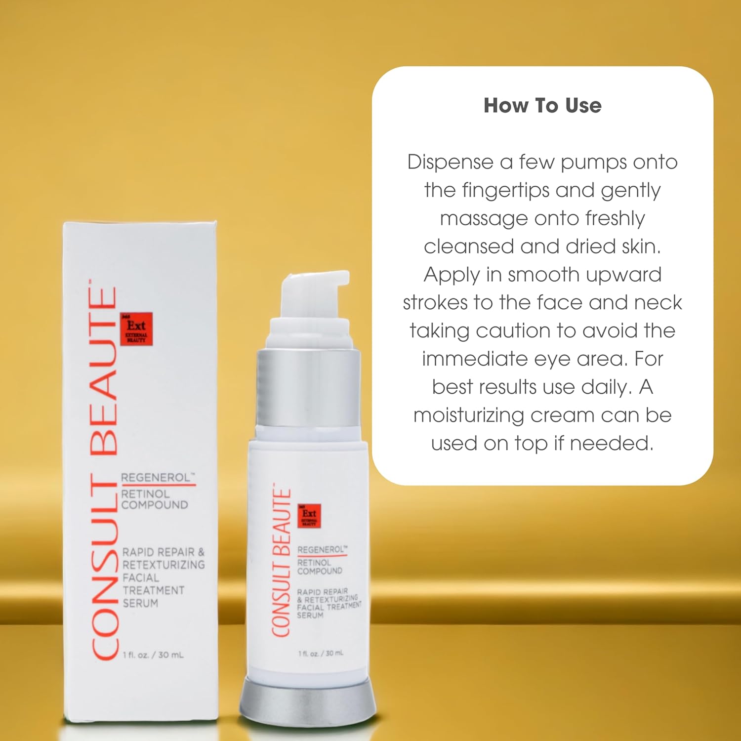 Consult Beaute - Regenerol Retinol Compound Serum for Face - Rapid Repair & Retexturizing Skin Treatment for Lines and Wrinkles - Hydrating Hyaluronic Acid - AHA -1 Fl. Oz.