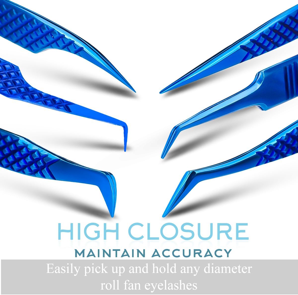 SIVOTE Eyelash Extension Tweezers Fiber Tips Japanese Steel, Set of 6 – Curved, Dolphin, 90° 45° Volume Boot & Slight Curved Tweezer – Professional Lash Tweezers for Lash Extensions Blue