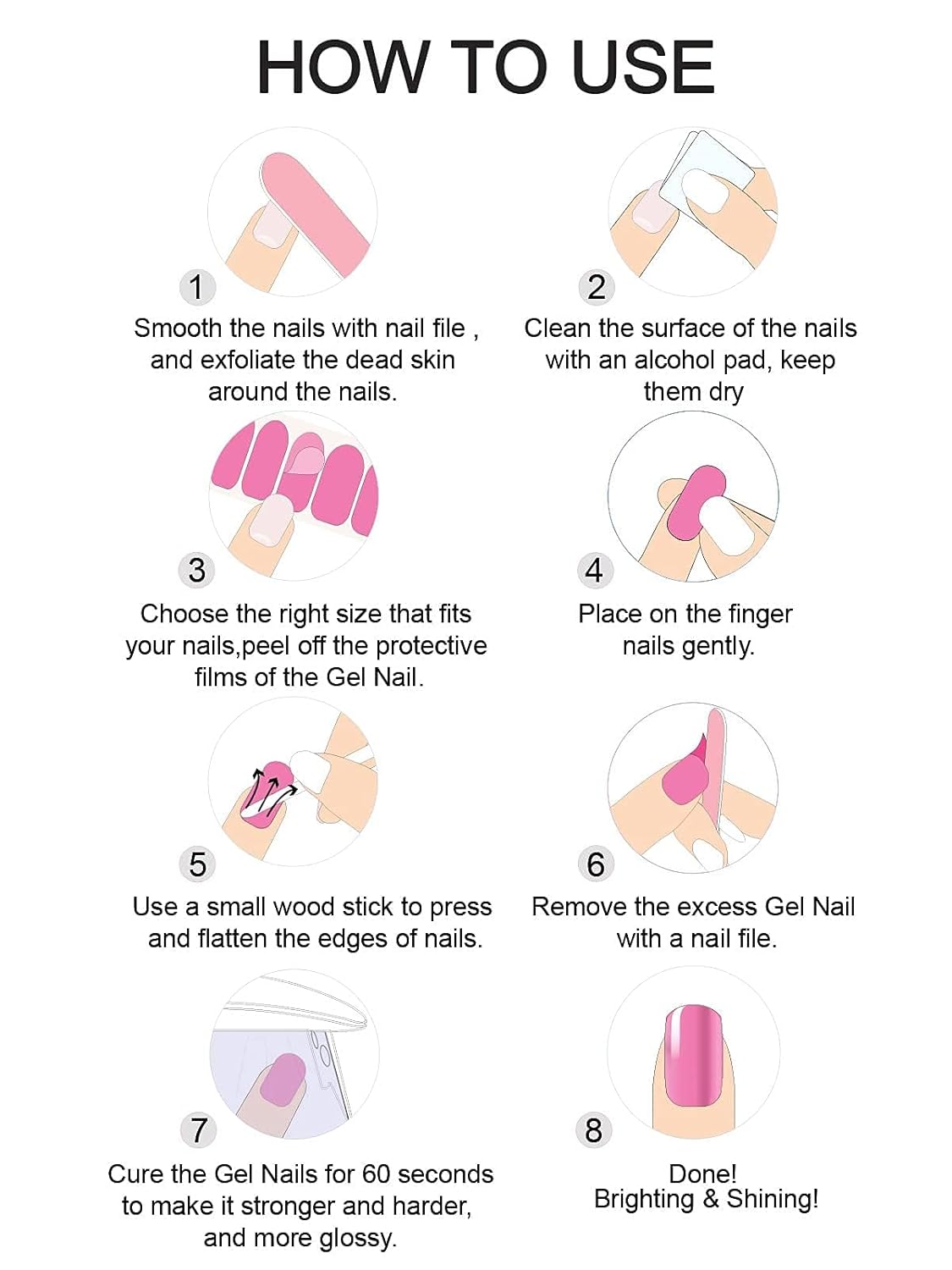 - Reminder: You need to cure the nail gel stickers under UV/LED light for about 60 seconds. If the gel nails wraps are not fully cured, the curing time can be extended. Ensure that any remaining full nail wraps are stored back into our black bag, and use a sealing strip to seal the opening to avoid drying out.