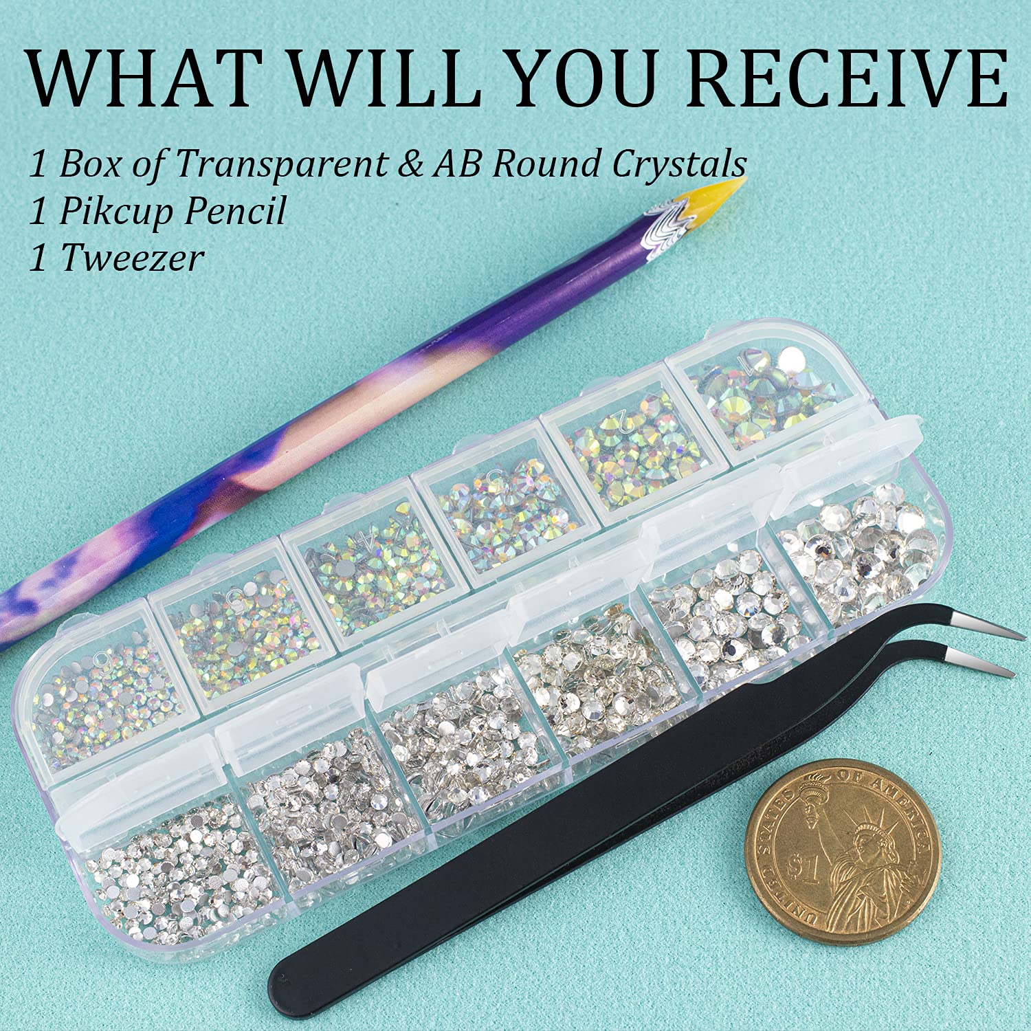 - ❤WHAT YOU WILL RECEIVE -- 1 Box of 6 Sizes Transparent White and AB Round Glass Nail Crystal Rhinestones Beads (Totally About 1720 PCS); 1 PCS Rhinestone Picker Pencil; 1 PCS Tweezer. The Well Equipped Rhinestone Set Is Suitable for Both Professional Nail Technician and Inexperienced Starter for Nail Art.