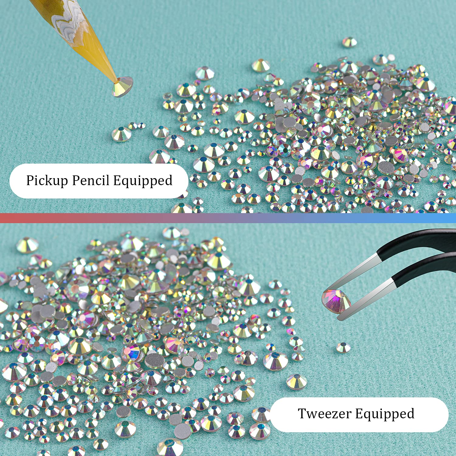 - ❤HELPFUL PICK-UP TOOLS -- The Tools Can Be Used for Multi-Function, including Round and Multi-shaped Crystals, or Flatback or Non-Flatback Crystals. After Applying Nail Polish, Just Simply Use the Equipped Tools ( Pickup Pencil + Tweezer ) to Pick Up the Crystals onto Your Nails to Create Your Fabulous DIY Designs! They Are Very Helpful in Picking Up Small Crystals. Just Make Sure You Make the Rhinestones Face up First Before You Start Working on Your Nails.