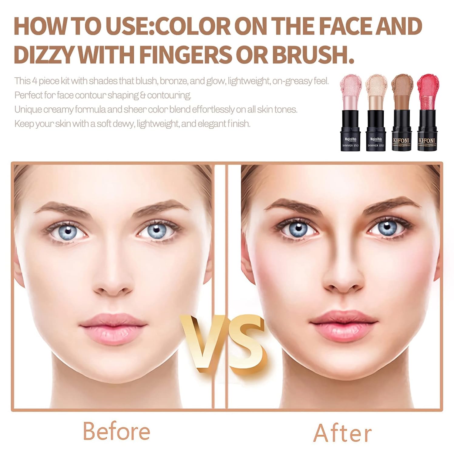- 【How to Use】Using a bronzer contour stick, apply the shadow color to your cheekbones and cupids, as well as the sides of your nose, hairline, and under your jawline. Apply highlighter to T-zone, cheekbones and chin. Then apply blush to your cheeks. then use a soft makeup brush to smooth out until it blends into your skin for a natural, perfect matte finish look.