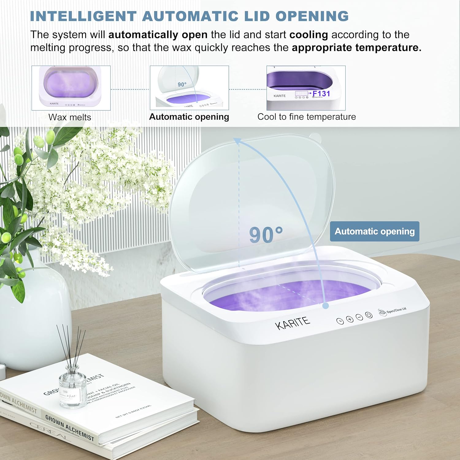 - INNOVATIVE AUTO OPEN LID DESIGN – Unlike ordinary paraffin baths with hand operated lids, KARITE paraffin wax machine is developed with an auto lid that opens when the wax is melted and reached the desired temperature to reduce the cooling time, allowing you to enjoy your relaxing paraffin treatment without prolonged waiting.