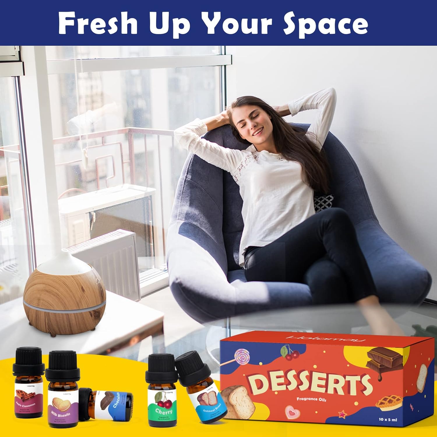 - Delicious 10 Dessert Fragrance Oils (5ML Pack); Each our scented oils bursts a warm and yummy fragrance of homemade desserts - creamy vanilla, apple cinnamon, strawberry, sugar cookies, rainbow candy, chocolate, cherry, blueberry sauce, milk biscuits, oatmeal bread, smell like everything delicious from kitchen
