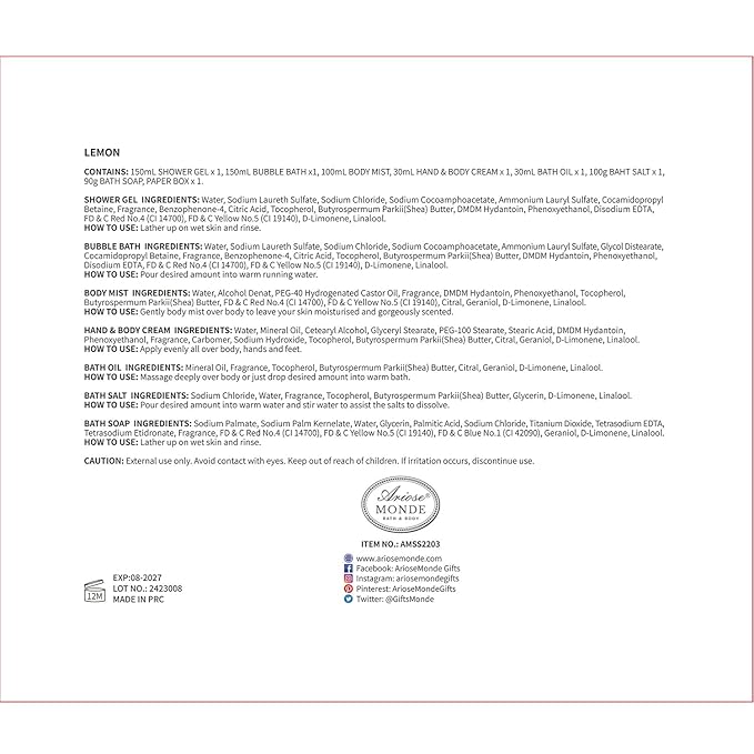 - LEMON CITRUS SCENT: This fresh scent emits a sparkling Lemon fragrance with notes of green lemon leaves, citrus, and warm white musk. All the Ariosemonde Spa sets are cruelty and paraben-free, We do not test our products on animals