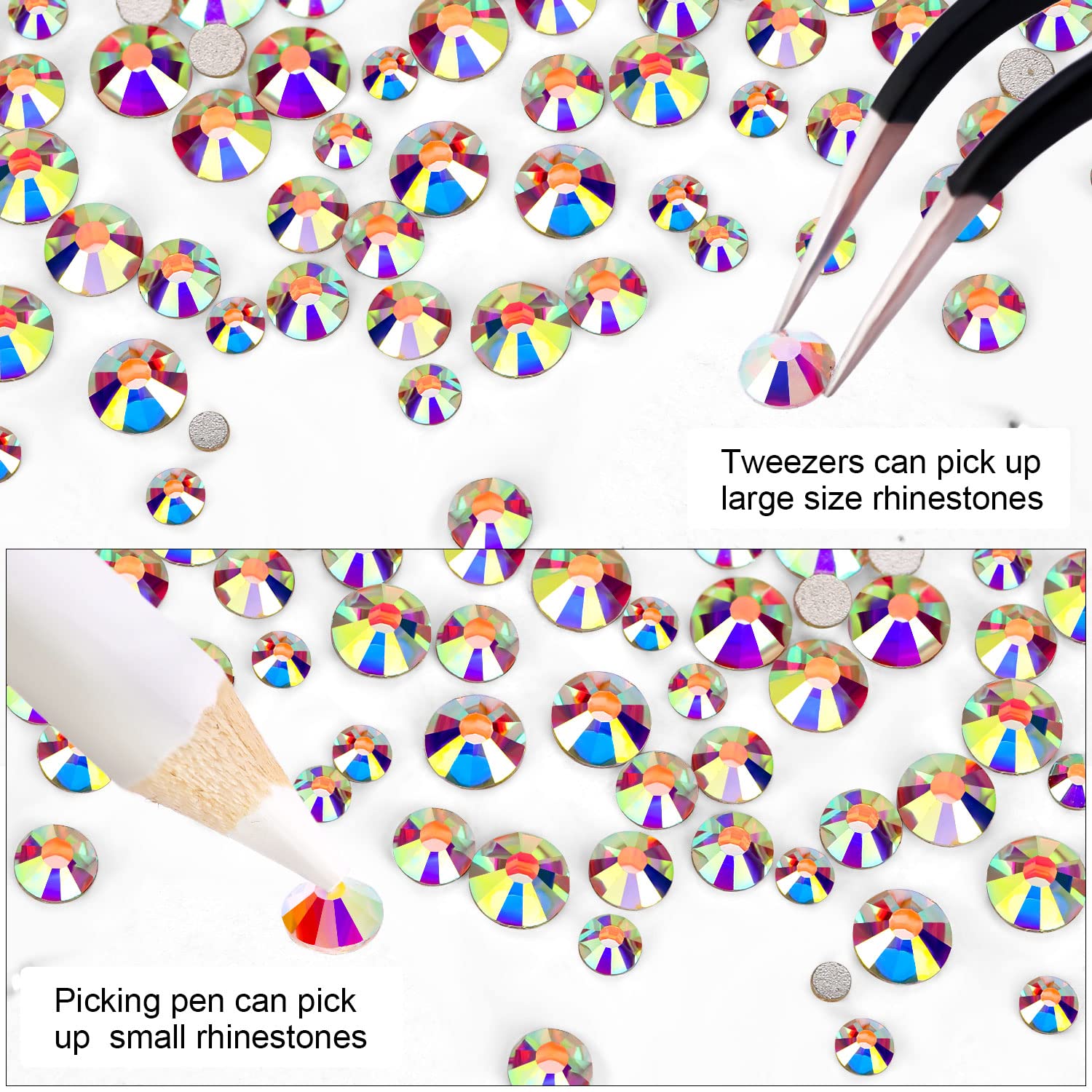 - 💎Use tweezers and Picking Pen gem picker to pick rhinestones, There is no glue on the bottom, additional nail gel is required, or other professional glue for makeup or nails. Can use E6000 super glue to fix on crafts, art decoration. not hotfix.