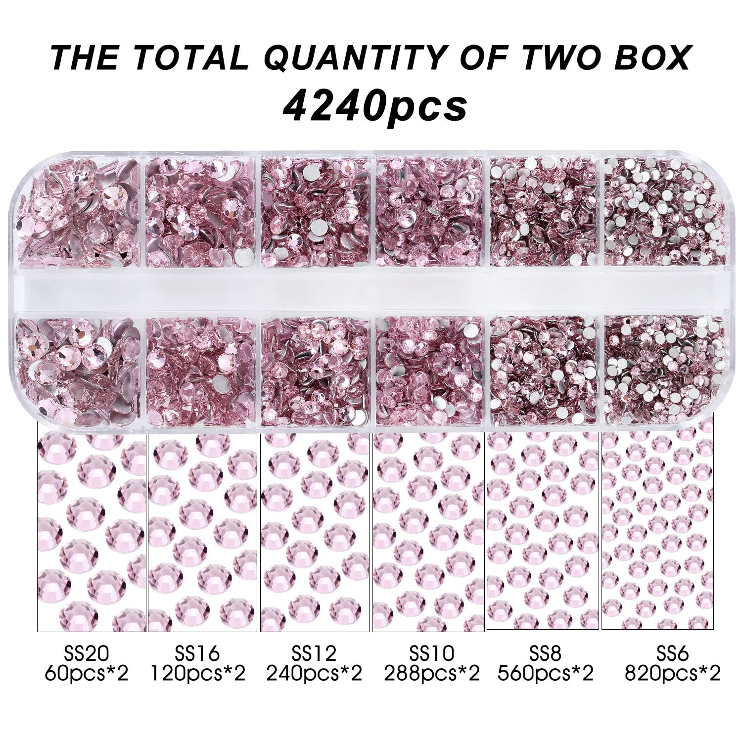 4240Pcs Flatback Pink Rhinestones Glass Crystal Gemstones for Nail Art Jewels Makeup Shiny Round with Tweezers and Picking Pen (SS6~SS20 Set)