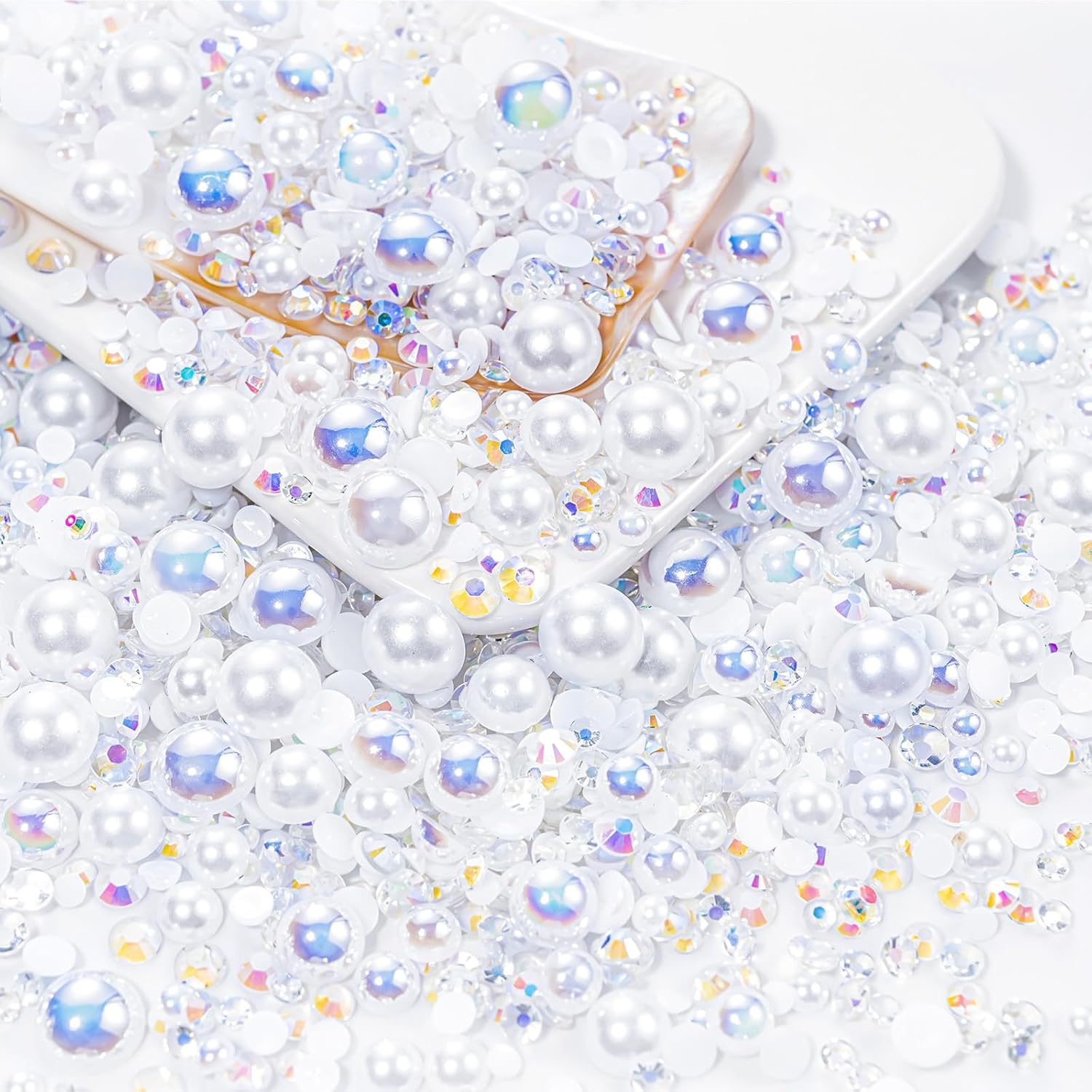 - What You Will Receive: 60g(30g*2)mixed size flat back pearls and rhinestones. 3*Rhinestone Glue. 1* wax pencil for rhinestones. 1*Pencil sharpener(color random). The mix half round pearls and rhinestones can make more beautiful handicrafts for your friends, parents, yourselfs on any festivals.If you need a mixed size pack of pearl rhinestones, search on Amazon:B0BBL1KVMD