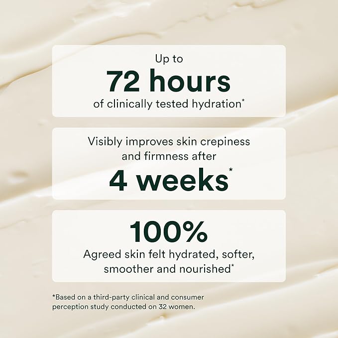 - Revitalize Aging Skin with Firming Hydration: Elevate your skincare routine with this high-performance body butter. Infused rich shea butter, it transforms dry, crepey skin into soft, supple perfection. Up to 72 hours of clinically tested hydration.